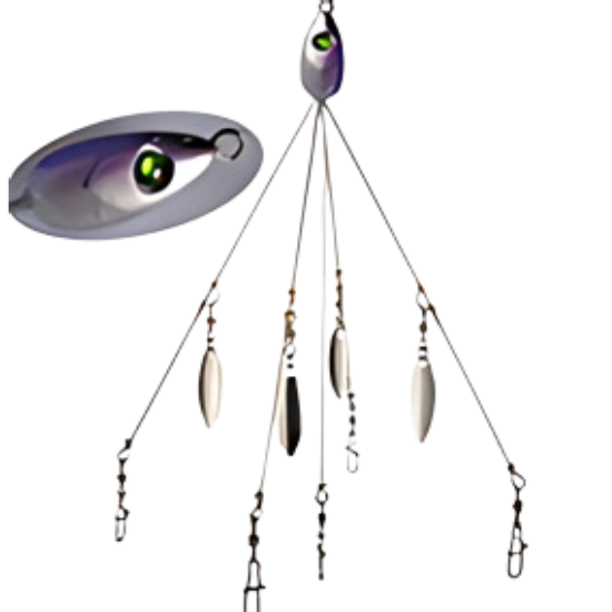 The Bass Angler's Club Umbrella Rig is perfect for avid fishermen looking to save money and avoid losing their expensive rigs. Featuring 4 spinners and 5 arms with swivels, this rig allows you to customize your setup with swim baits for the ultimate fishing experience.