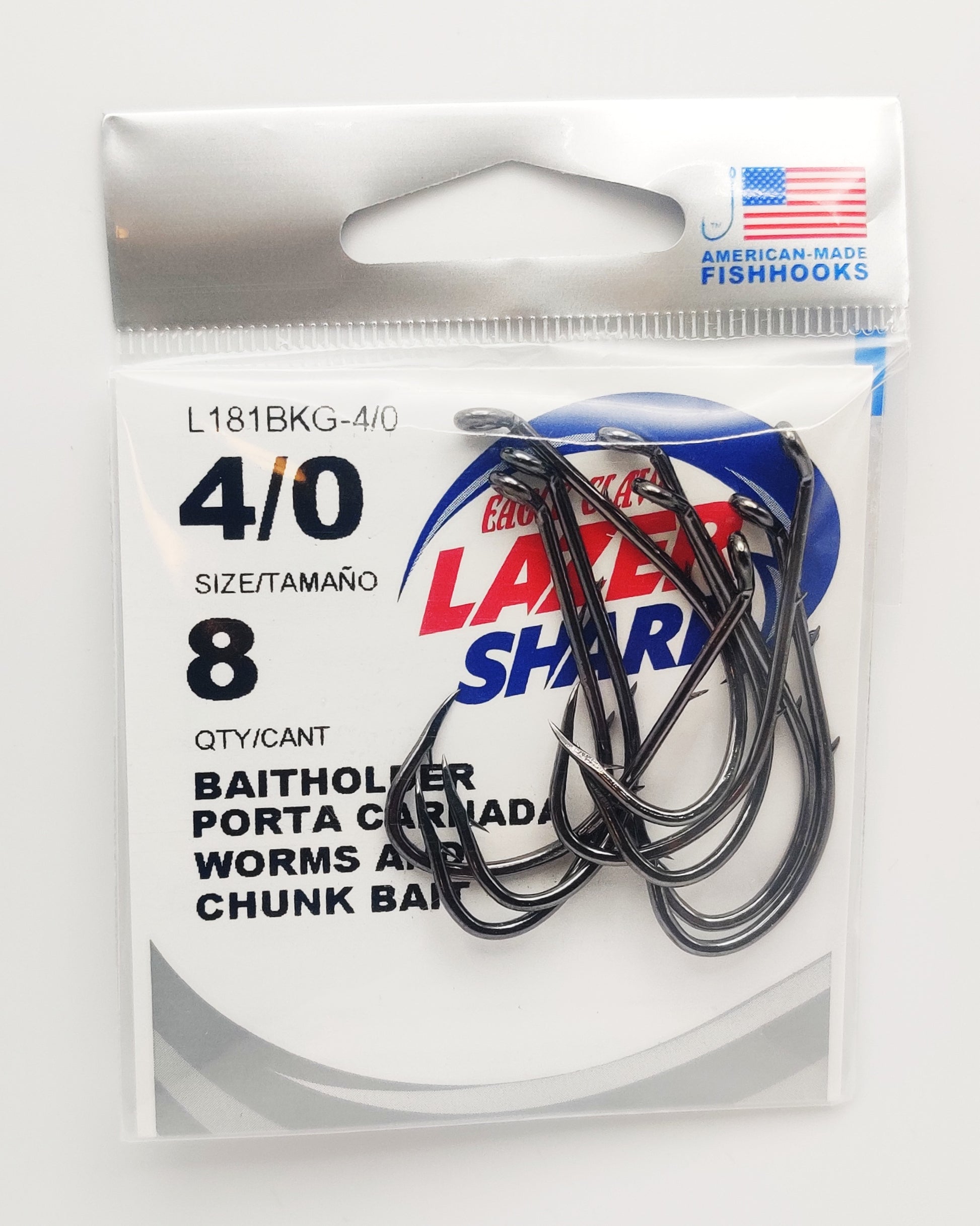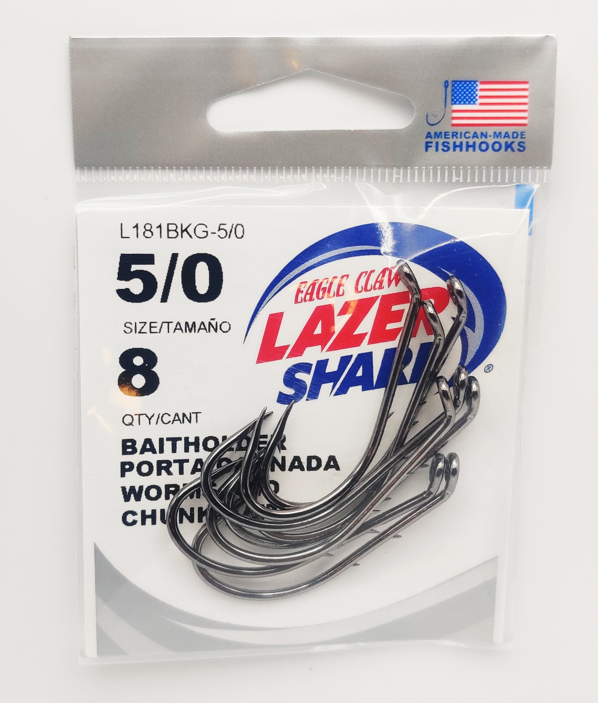 Eagle Claw® Lazer Sharp® Baitholder Hooks are famous for delivering the perfect combination of strength, design, and performance. Highlighted by ultra-sharp points and consistent construction, Eagle Claw Lazer Sharp Worm Hooks are ideal for a wide variety of plastic worm applications. Lazer Sharp Down Eye Baitholder (Model L181F): Eagle Claw Point, down eye, two slices on shank, forged construction, and offset design. Bronze finish.