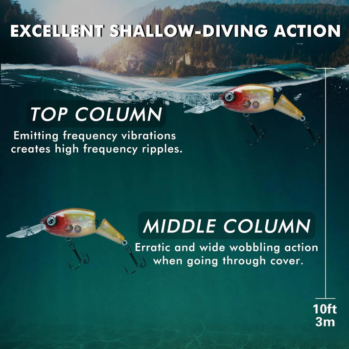 - Surf Suspending Swimmer - The Truscend jointed swimmer can suspending on strike zone just like the real thing, it is just too much for even the wariest fish to resist. It features a large diving lip that helps them dive quickly, this jointed construction produces a much wider wobbling action than most crankbaits. They are also engineered to sustain a true running depth and maintain their action for the majority of the retrieve.
